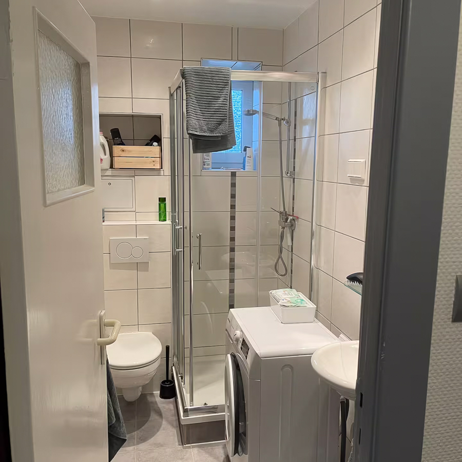 Das Badezimmer ist modern gestaltet und mit einer komfortablen Dusche, frischen Handtüchern, einem Haartrockner sowie einer Auswahl an Pflegeprodukten ausgestattet. Eine Waschmaschine steht Ihnen ebenfalls zur Verfügung – ideal, wenn Sie länger bleiben oder einfach unabhängig bleiben möchten.