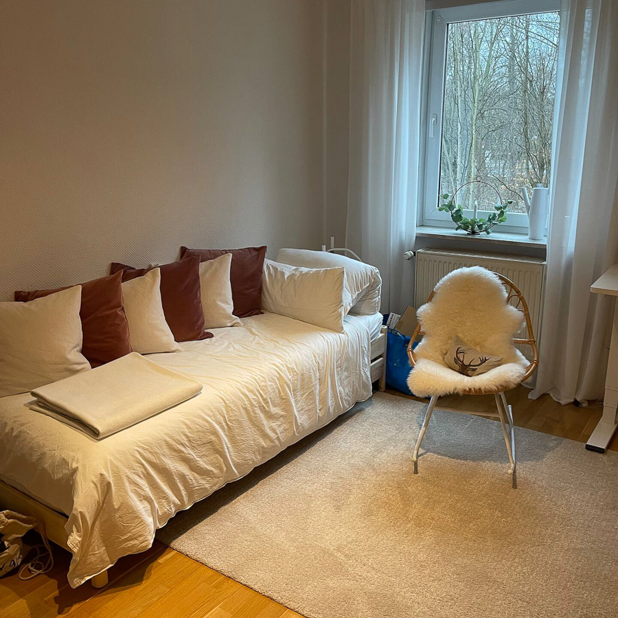 Das helle und freundliche Wohnzimmer lädt zum Verweilen ein. Ausgestattet mit einem hochwertigen Parkettboden, einer modernen Schlafcouch und einem großen Flachbildfernseher, ist es der perfekte Ort, um sich nach einem langen Arbeitstag oder einem Stadtbummel zu entspannen. Auch im Schlafzimmer steht Ihnen ein Fernseher zur Verfügung – so können Sie sich abends auch gemütlich im Bett unterhalten lassen.